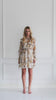 A floral print dress featuring frills across the neckline, elbows & cuffs. The elasticated waistline also features a drawstring with gold tips. Fully lined.